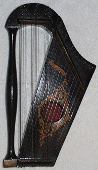 [Oh, that "for many years to come" - amazingly enough, in the 50's or 60's, someone revived the concept. The "Hill Country Harp" has a swiveling harmonica holder (though it doesn't blow into the sound box), a shape that's roughly like the Harp-O-Chord, and 4 individual bass strings. But they were even more, uh, innovative... Borrowing from an Indian instrument called a bulbul tarang, they laid out a set of 4 more strings tuned to the tonic chord. Under one end lies a set of 3 partial bridges, with spring-loaded levers above them. When pressed, the lever "frets" the strings to produce a chord which corresponds to one of the other bass notes. This one takes about 2 1/2 hands to play...]